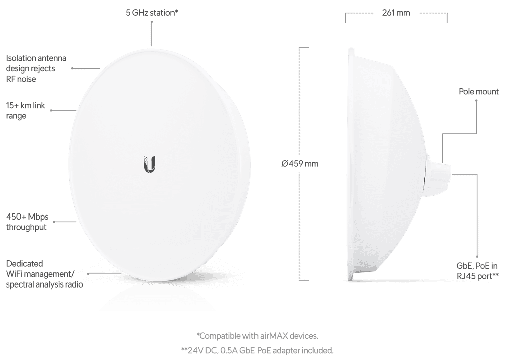 Ubiquiti airMAX PowerBeam 5AC ISO SKU: PBE-5AC-ISO-Gen2 Description: Ubiquiti's airMAX® engine with custom IC dramatically improves TDMA latency and network scalability. The custom silicon provides hardware acceleration capabilities to the airMAX scheduler, to support the high data rates and dense modulation used in airMAX ac technology. Tech Specs: Click Here Features: •5 GHz, 15+ km link range •450+ Mbps throughput •Isolation antenna design rejects RF noise •Dedicated spectral analysis radio •Dedicated WiFi management radio •Note. This product should be purchased in pairs in order to form links.