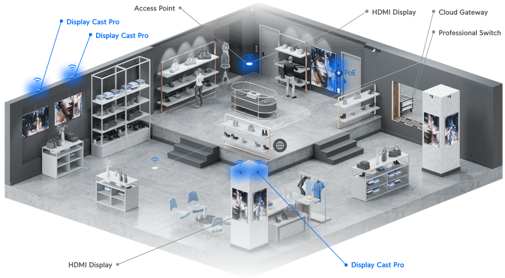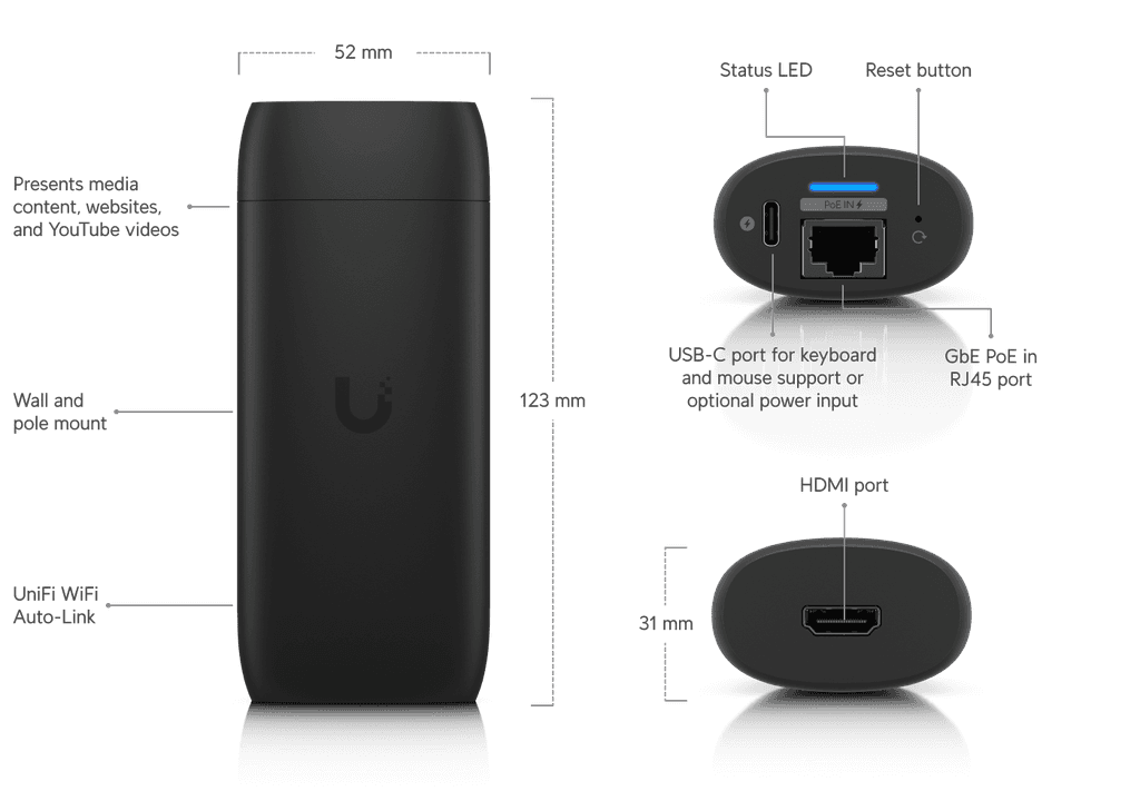 Ubiquiti Display Cast Pro SKU: UC-Cast-Pro Managed digital signage player for HDMI displays with media content playback, web mode, and USB-C peripheral support. Tech Specs: Click Here Installation Guide: Click Here Features: •Presents media content up to 4K resolution, websites, and YouTube videos to any HDMI-compatible display •Create multimedia playlists and dynamic digital signage layouts with UniFi Connect •Automatically power on/off display with HDMI CEC •Keyboard and mouse control via USB-C •PoE in or USB-C adapter power •Connected with UniFi WiFi Auto-Link or Ethernet *Note. USB-C power adapter and HDMI cable not included. Does not support Protect camera streaming. Use Protect Viewport to view Protect camera feeds on an HDMI display.*