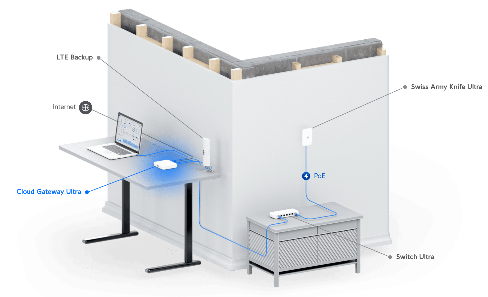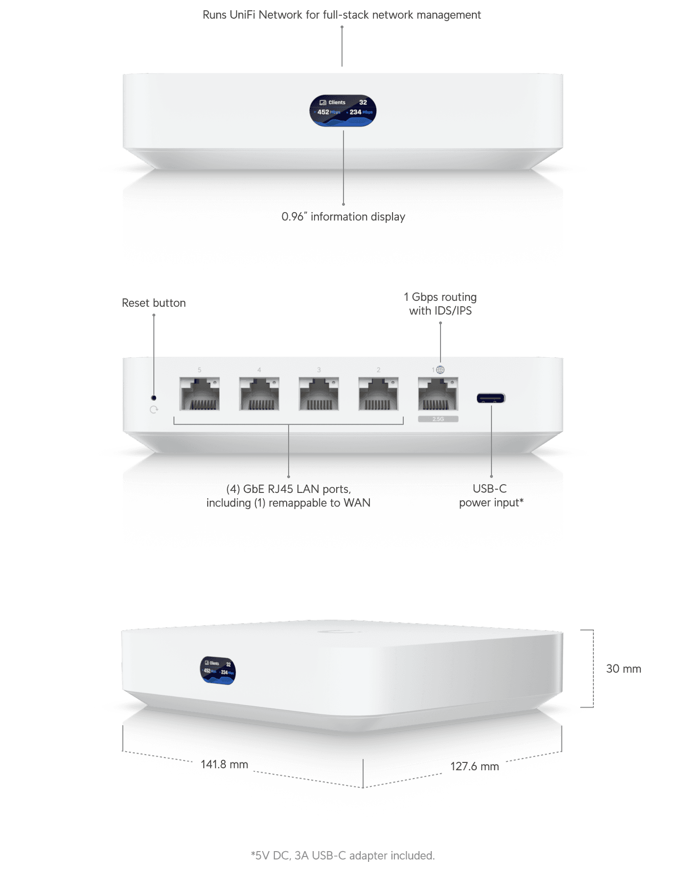 Ubiquiti Cloud Gateway Ultra SKU: UCG-Ultra Tech Specs: Click Here Installation Guide: Click Here Description: Powerful and compact multi-WAN UniFi Cloud Gateway with a full suite of advanced routing and security features. Features: •Runs UniFi Network for full-stack network management •Manages 30+ UniFi Network devices and 300+ clients •1 Gbps routing with IDS/IPS •Multi-WAN load balancing •0.96' LCM status display •Power method: USB type C (5V DC/3A) (adapter included) •IDS/IPS throughput: 1 Gbps •Supported voltage range: 100–240V AC •Max. power consumption: 6.2W