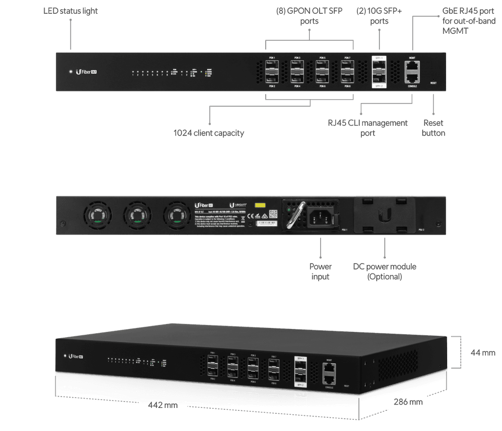 Ubiquiti UFiber OLT SKU: UF-OLT Description: Eight-port GPON optical line terminal (OLT) designed to manage fiber internet service for up to 1,024 clients (128 per port). Tech Specs: Click Here Features: •GPON. 2.488 Gbps down / 1.244 Gbps stream capacity •1024 Client capacity (8 ports) •(2) 10G SFP+ uplink ports •1U Rack mount •Power redundancy support