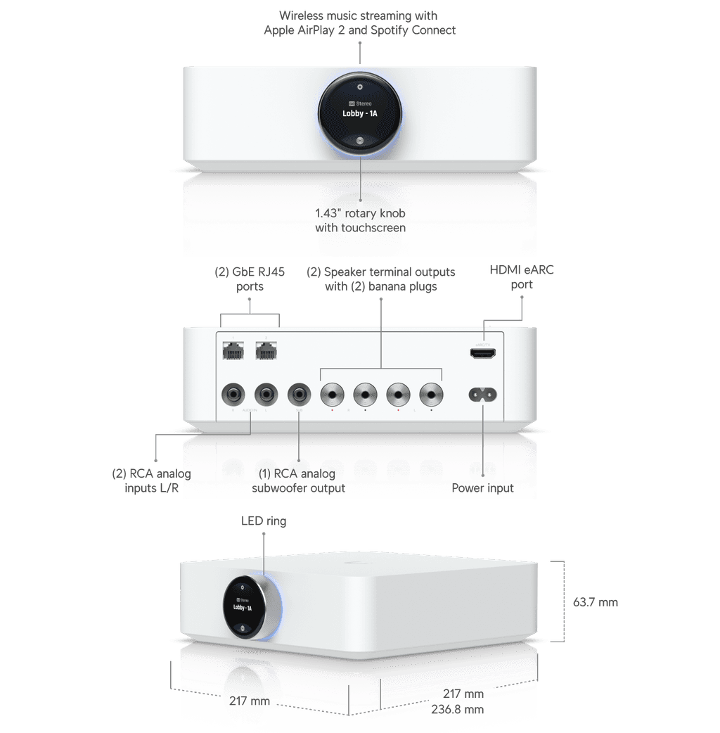 UbiquitiPowerAmp, White SKU: UPL-Amp-W Tech Specs: Click Here Installation Guide: Click Here Description: Premium speaker amplifier designed for high-fidelity multi-zone audio streaming and immersive spatial sound experiences. Features: •White •Low-latency wireless audio streaming with Apple AirPlay 2 and Spotify Connect •130 watts per channel at 8 ohms •(2) speaker terminal outputs with (2) custom-designed banana plugs included •(1) RCA analog subwoofer output •(2) RCA analog inputs for left and right channels •(1) HDMI eARC input with immersive spatial sound powered by Dolby Atmos •1.43' rotary knob with touchscreen •Effortless setup, management, and group control with the UniFi Play mobile app