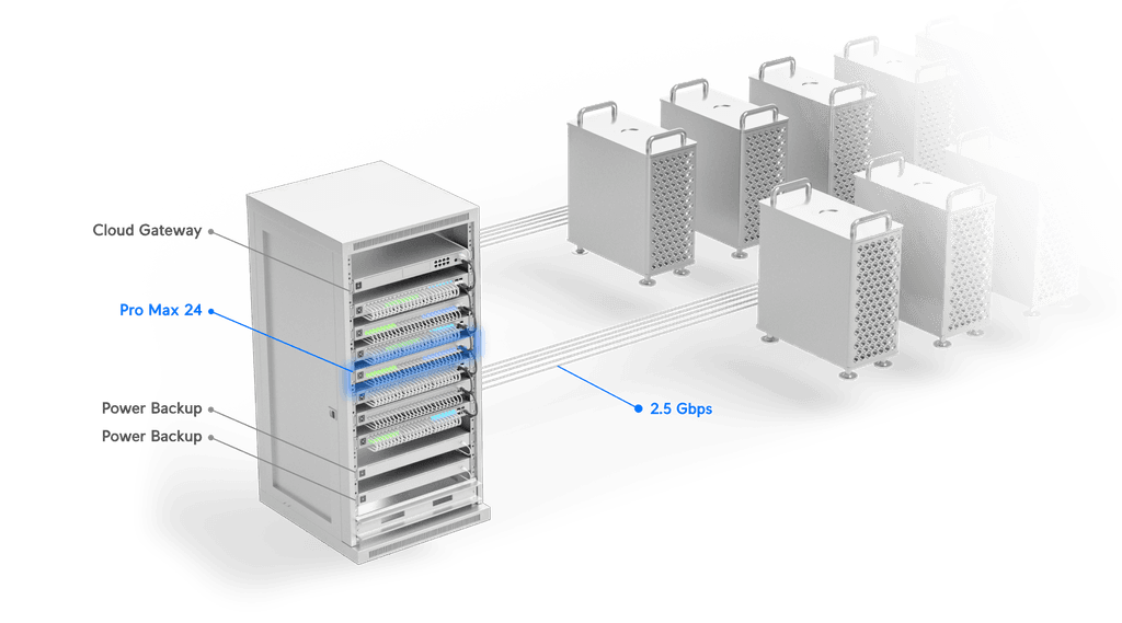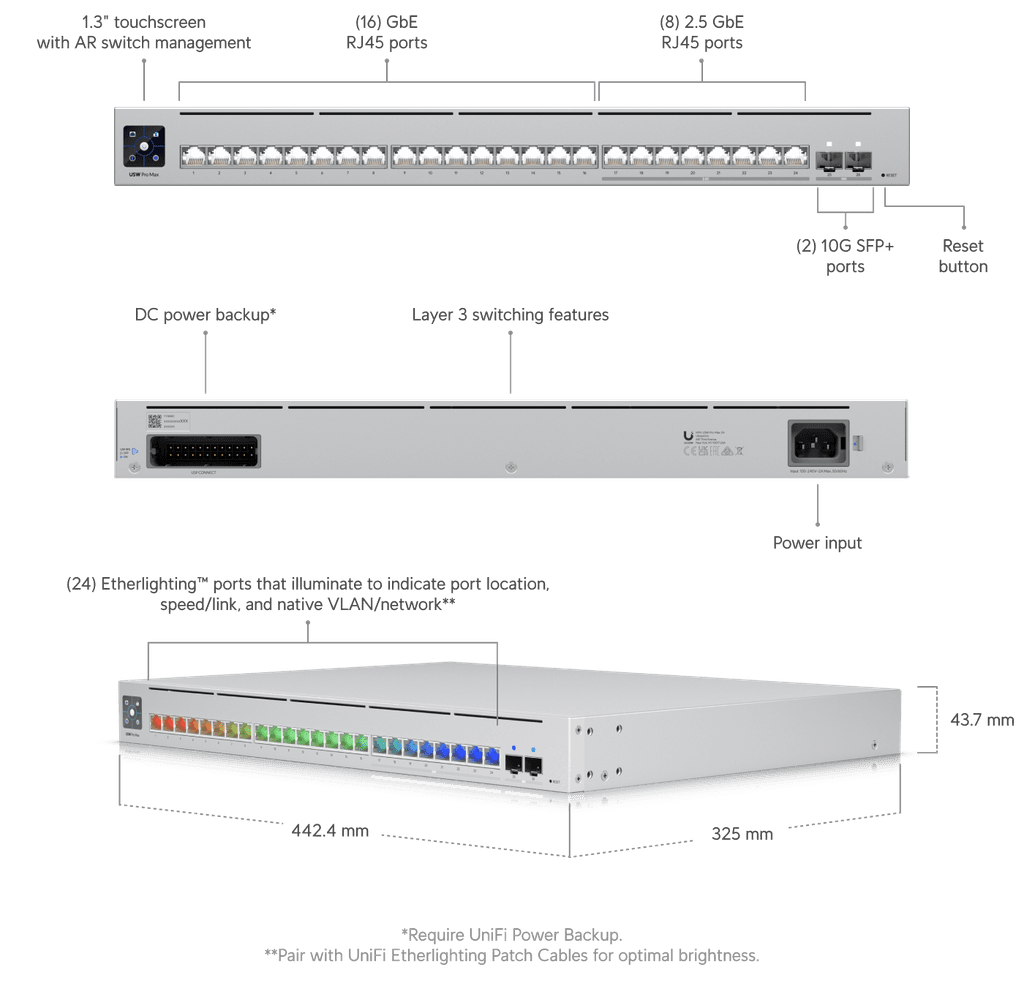 Ubiquiti Pro Max 48 SKU: USW-Pro-Max-48 Tech Specs: Click Here Installation Guide: Click Here Description: A 48-port, Layer 3 Etherlighting™ switch with 2.5 GbE. Features: •Etherlighting™ ports that illuminate to indicate port location, speed/link, and native VLAN/network* •(16) 2.5 GbE RJ45 ports •(32) GbE RJ45 ports •(4) 10G SFP+ ports •DC power backup ready •Managed with UniFi Network 8.0.24 and later •*Pair with UniFi Etherlighting Patch Cables for optimal brightness.