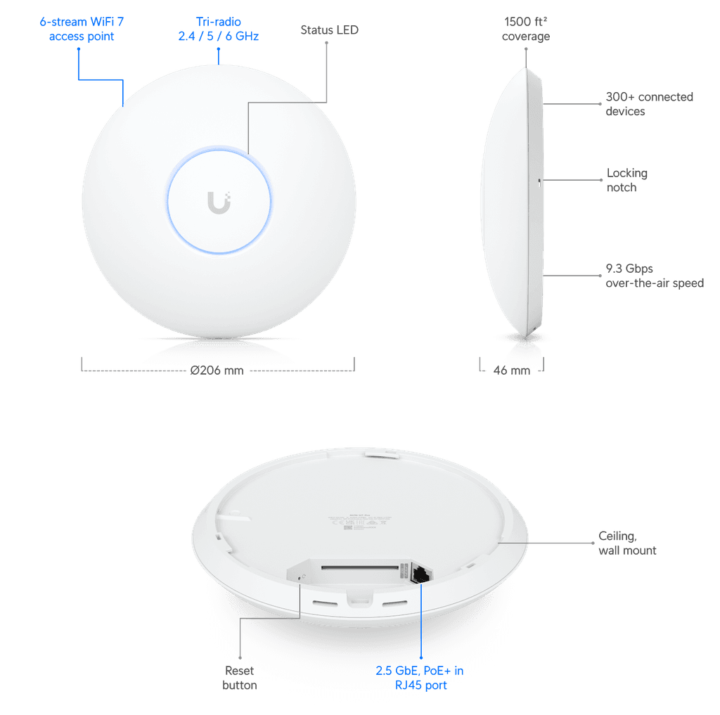 Ubiquiti UniFi WiFi 7 AP,5 Pack ,Ceiling-mount, AP 6 GHz Support, 2.5 GbE Uplink, 9.3 Gbps Over-the-air Speed,PoE+ Power,300+ Connect Device, 2Yr Warr