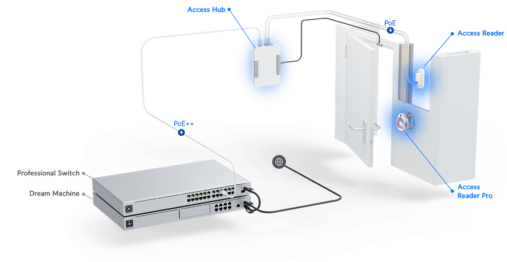 Ubiquiti UniFi Access Hub Describation: The Access Hub is a single-door mechanism that provides complete entry and exit control via connected Access Readers. SKU:UA-HUB Tech Specs: Click Here Installation Guide: Click Here Features: •(2) Lock terminals (12V and Dry) •(2) AUX terminals for an external siren and automatic door opener •(4) Additional inputs (sensors and buttons) •Connect and power using PoE++ •Connect to two UniFi Access readers and one UniFi Protect camera