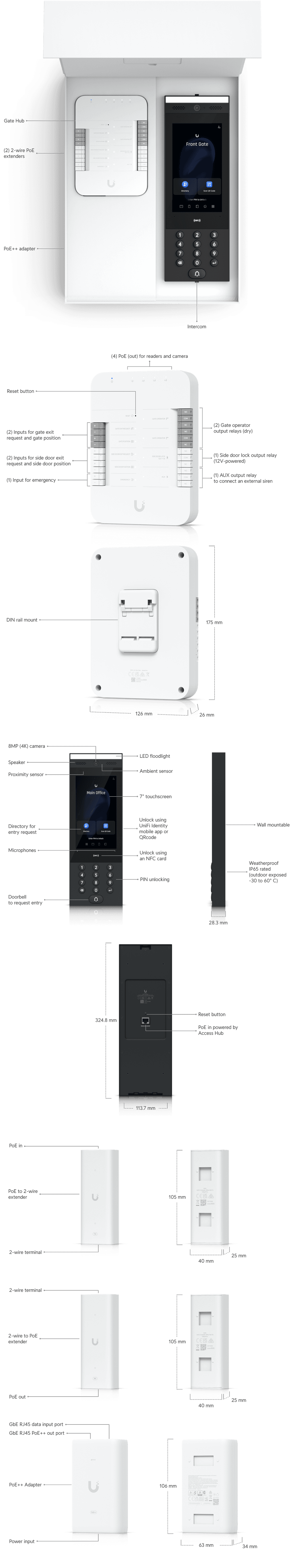Ubiquiti Gate Access Starter Kit SKU: UA-SK-Gate Tech Specs: Click Here Desription: Control a vehicle gate using the connected Intercom and authorize gate access with License Plate Unlock when paired with a compatible Protect AI camera*. Features: Includes •(1) Gate Hub •(1) Intercom •(1) PoE++ adapter •(2) 2-wire PoE extenders *Note. License Plate Recognition is supported on Protect AI Series cameras, excluding 360 lenses.