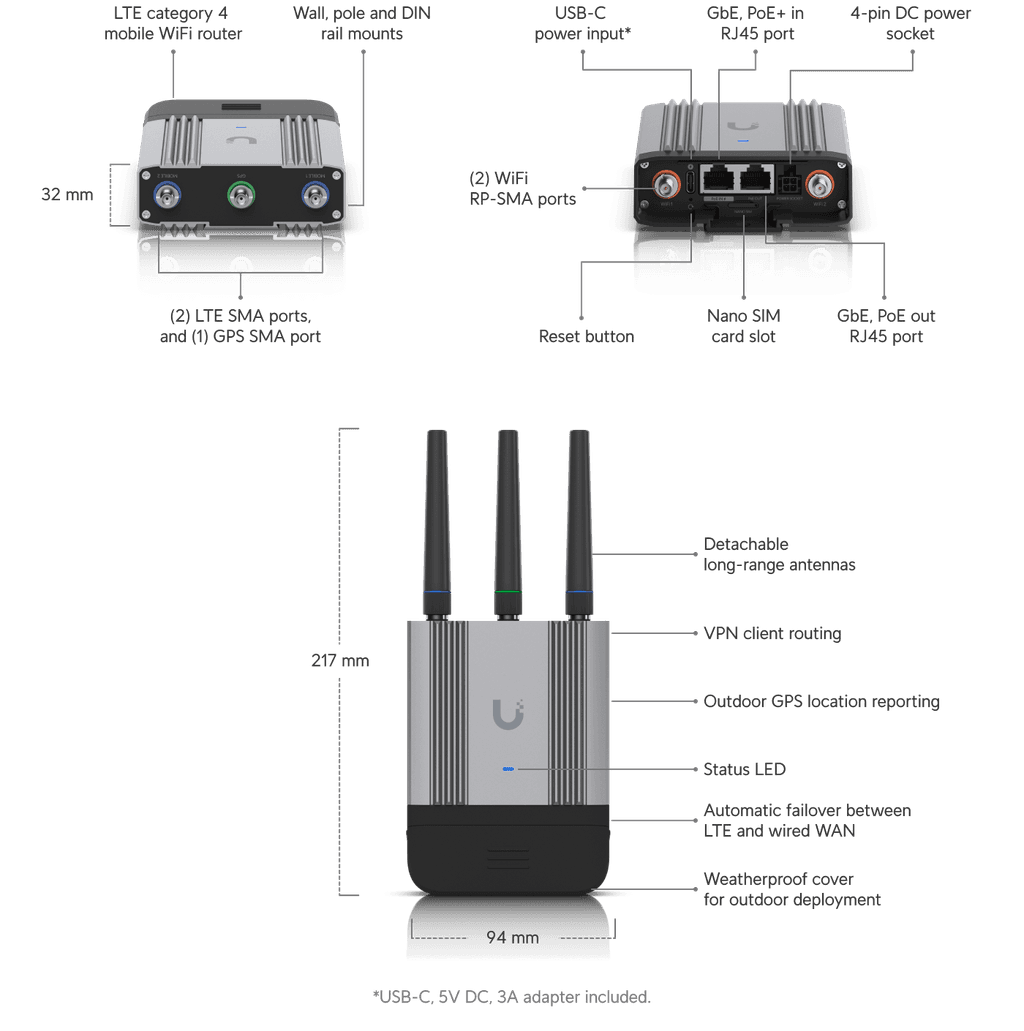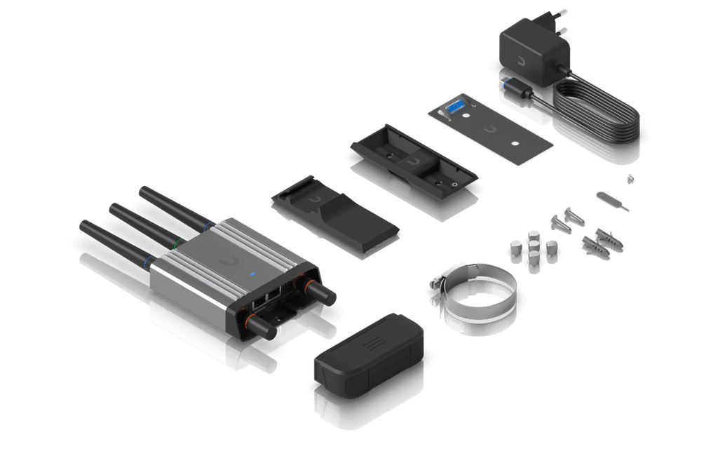 Ubiquiti Mobile Router Industrial SKU: UMR-Industrial Tech Specs: Click Here Installation Guide: Click Here Description: Compact and ruggedized LTE Cat 4 mobile WiFi router designed for indoor/outdoor IoT applications. Features: •Site-to-site VPN and VPN client routing •Automatic failover between LTE, wired WAN, and WiFi WAN* •(2) GbE ports with (1) PoE output** •Outdoor GPS location tracking •Flexible wall, pole, and DIN rail mounting •Weatherproof (outdoor exposed) with the included cover •Optional Mobility Cloud subscription*** *WiFi WAN support will be available by the end of 2024 Q2. *PoE+ input required for PoE passthrough.